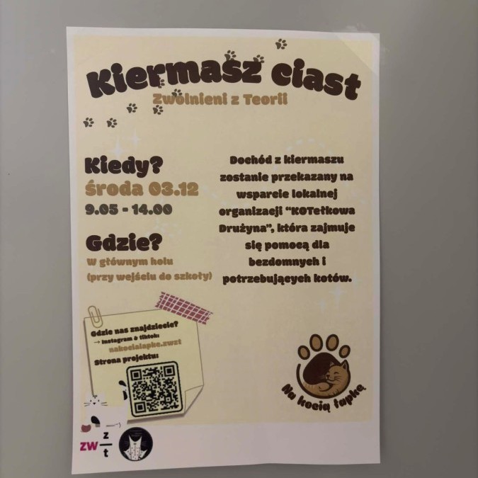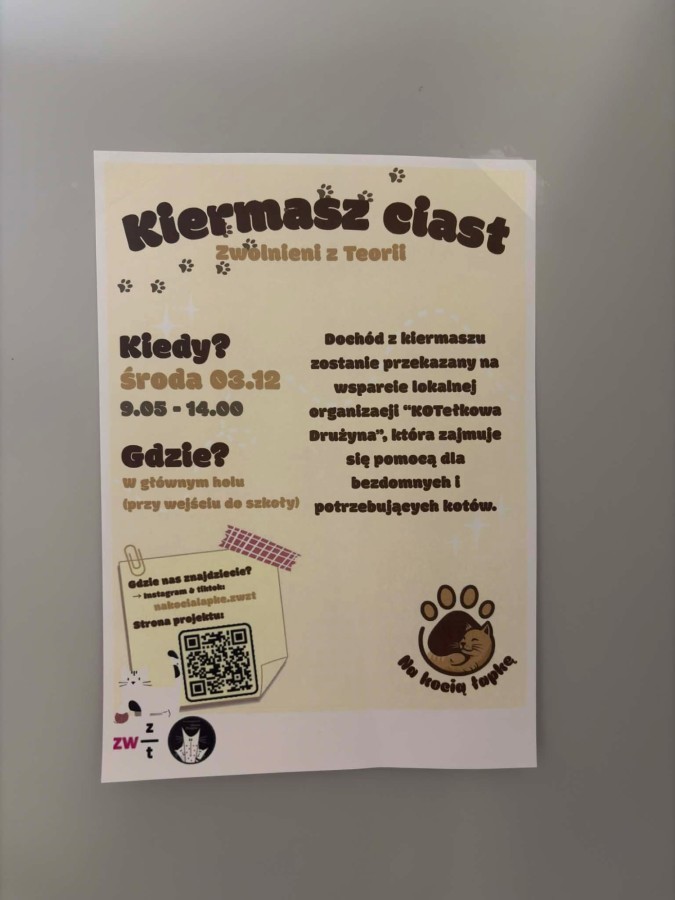 W ramach projektu „Na Kocią Łapkę”, realizowanego w ogólnopolskiej olimpiadzie „Zwolnieni z Teorii”, zorganizowałyśmy kiermasz wypieków na terenie naszej szkoły.