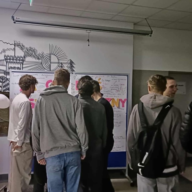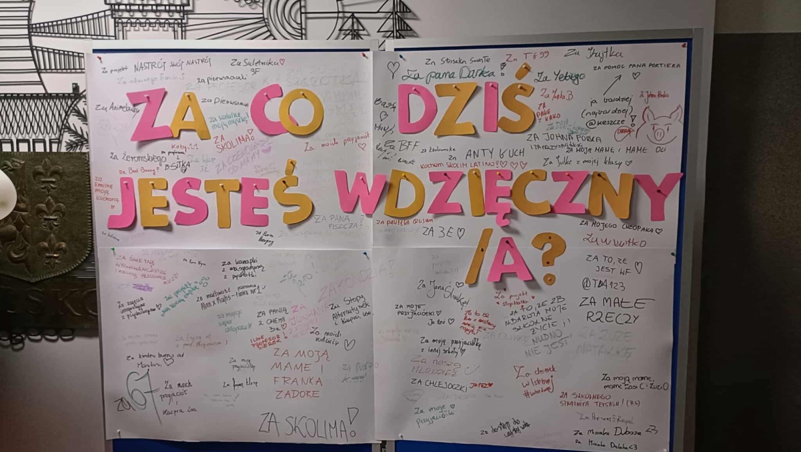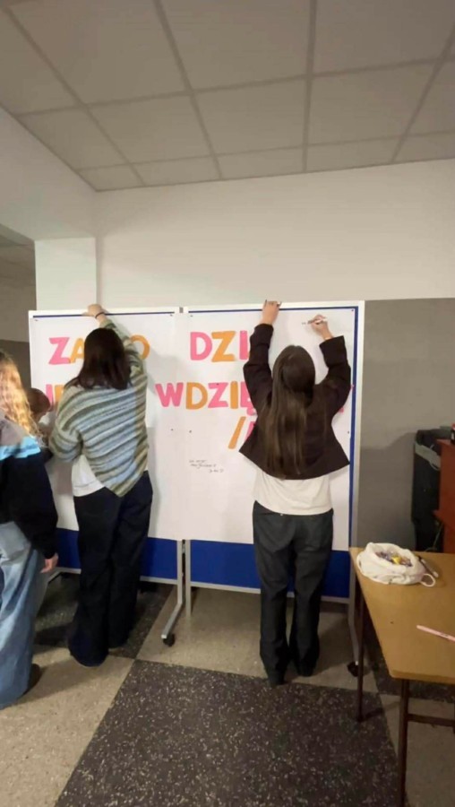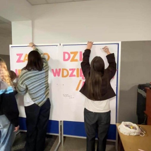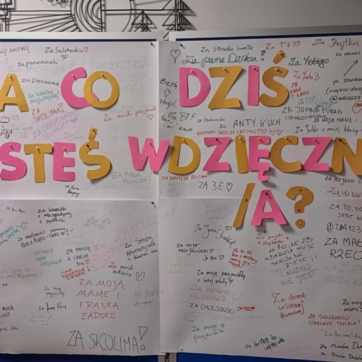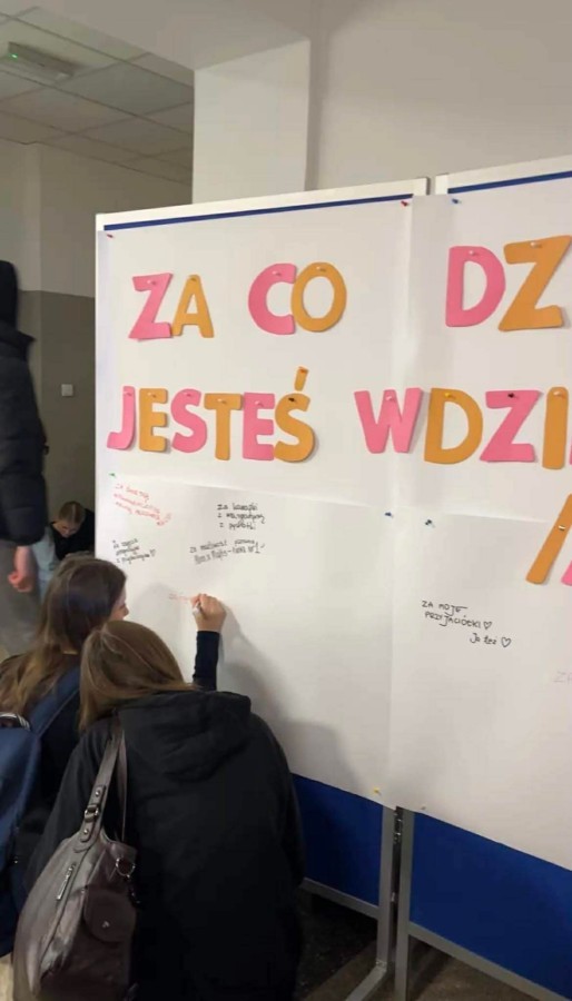 Na specjalnie przygotowanym brystolu z hasłem „Za co dziś jesteś wdzięczny/a?” uczniowie mogli anonimowo zapisać to, za co chcą podziękować – bliskim osobom, nauczycielom, przyjaciołom czy codziennym, małym rzeczom.